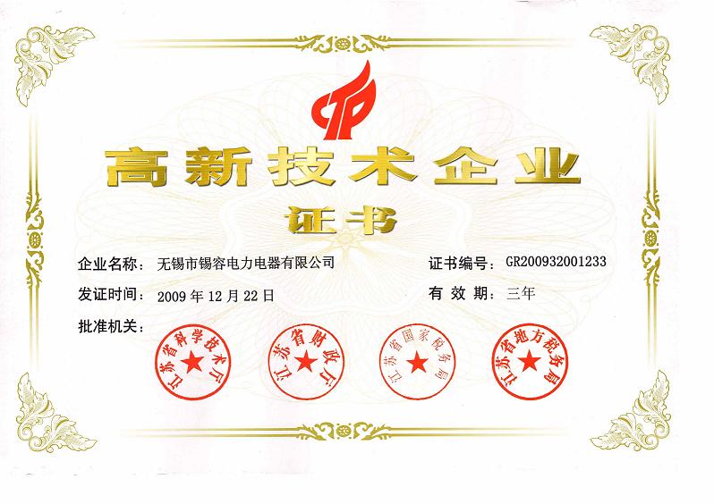 2009年12.22日,無錫市錫容電力電器有限公司獲取高新技術(shù)企業(yè)證書,批準(zhǔn)機(jī)關(guān):江蘇省科學(xué)技術(shù)廳、江蘇省財(cái)政廳、江蘇省國家稅務(wù)局,江蘇省國家稅務(wù)局